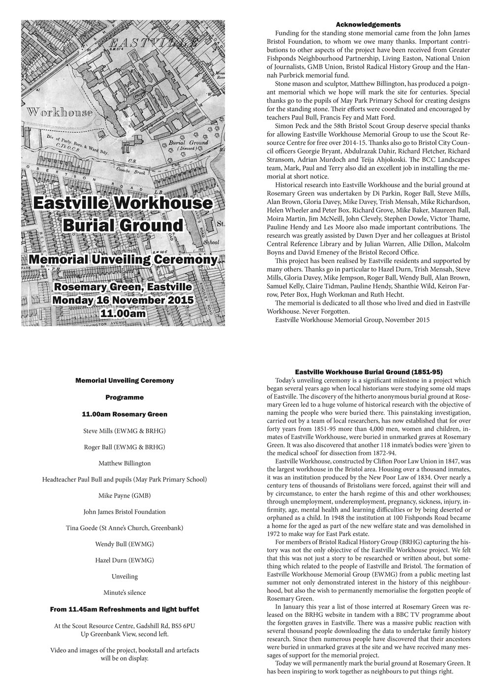 Among those taking part in the unveiling ceremony will be residents of East Park Estate who have campaigned for many years to improve facilities for children in the area, family historians whose ancestors were buried in Rosemary Green, pupils from May Park Primary School who have contributed to the project and researchers from Bristol Radical History Group.